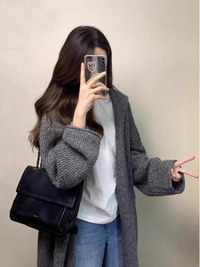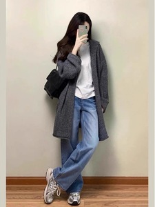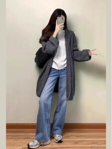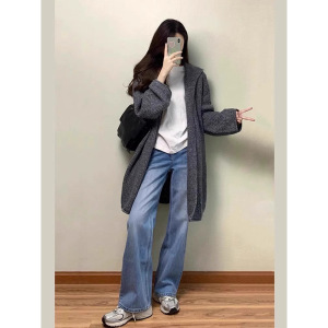 深秋初冬韩系穿搭洋气宽松软糯慵懒中长款毛衣外套牛仔裤两件套装