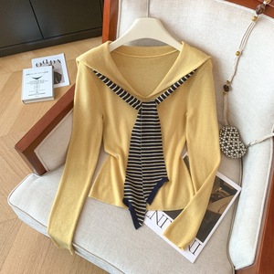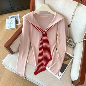 洋气显瘦条纹针织飘带长袖女2025秋季新款百搭海军领气质打底衫