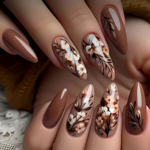 2025年跨境热秋冬摩卡棕简约优雅简约棕色纯色棕色花朵穿戴甲nail