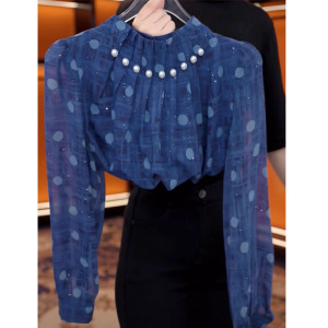 2025早秋高级感蓝色波点立领长袖衬衫女气质钉珠小衫减龄百搭上衣