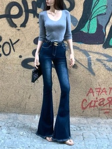 蓝色修身提臀微喇叭牛仔裤 女高腰显瘦长裤弹力毛边裤