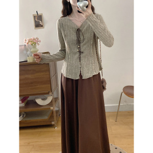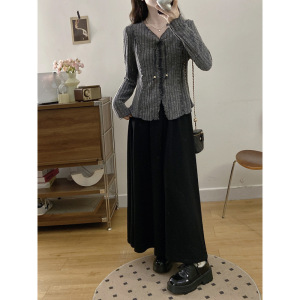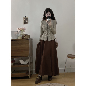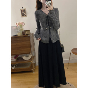 2025秋装新款胖mm大码女甜美坑条针织上衣中长款半身裙套装