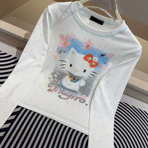 甜美可爱kt猫咪图案印花订钻长袖T恤女潮牌甜酷弹力修身显瘦上衣