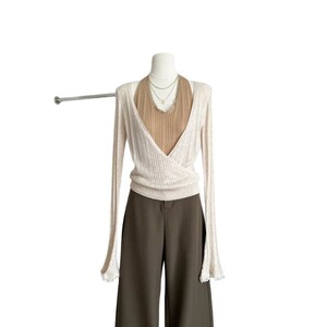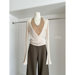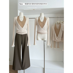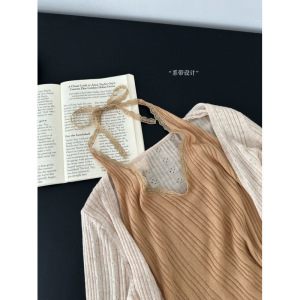 假两件蕾丝拼接针织衫长袖挂脖设计感上衣