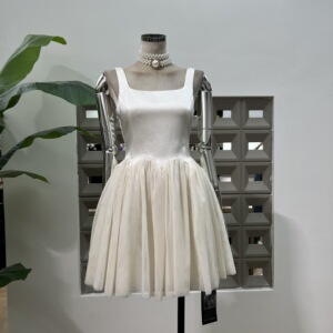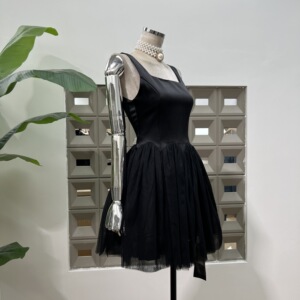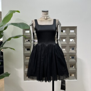 亚马逊新品2025高档CHIC方领拼接网纱蓬蓬短裙优雅气质掐腰背心裙