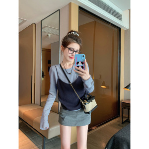 假两件针织吊带长袖t恤女2025新款早秋小个子收腰短款内搭上衣ins