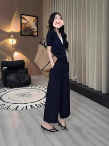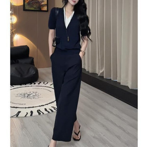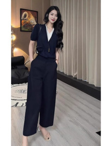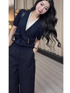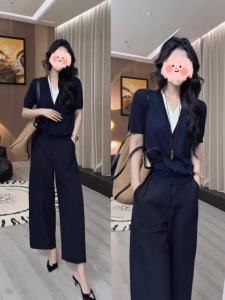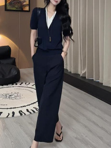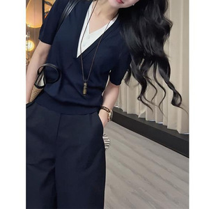 2025年夏秋季网红爆款藏蓝色针织假两件藏蓝色阔腿裤减龄气质套装
