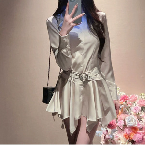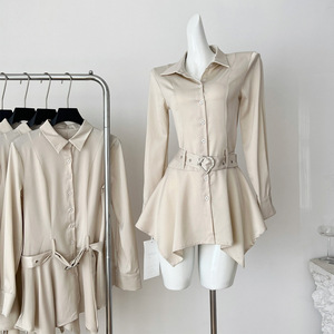 2025 秋季新款垂感长袖缎面衬衫连衣裙短款收腰a字裙含腰带休闲风