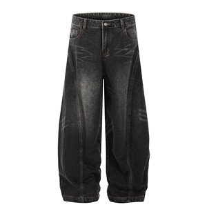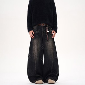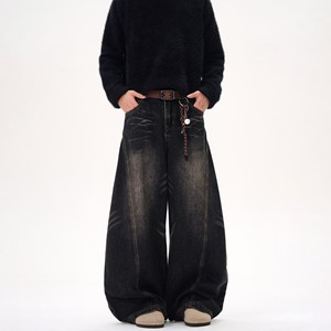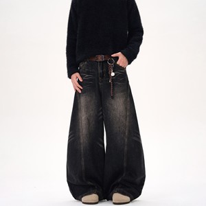 美式复古水洗设计感黑色弯刀牛仔裤男女阔腿宽松垂感做旧裤子代发