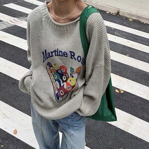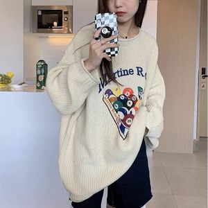 韩系慵懒风复古印花卷边套头毛衣女秋冬季韩版宽松遮屁股针织衫
