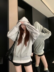 美式辣妹设计感铆钉连帽卫衣外套女装秋季慵懒宽松灰色开衫上衣潮