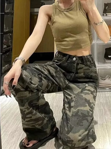 145小个子美式高街军绿色迷彩宽松直筒牛仔裤女高腰显瘦阔腿裤子