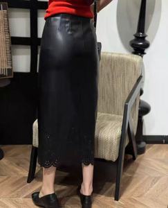 简约松紧腰复古PU皮半身裙女早秋新款镂空花边皮半裙后开叉皮裙子