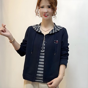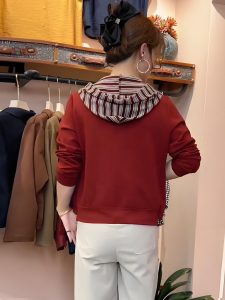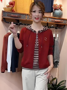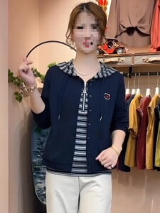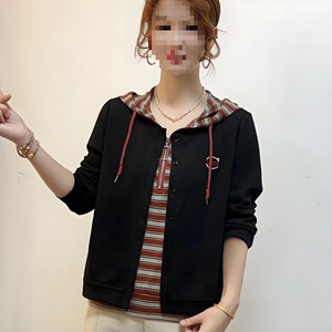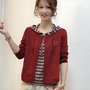 假两件时尚连帽卫衣女士2025秋季新款条纹拼接上衣妈妈装宽松开衫