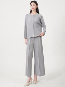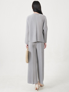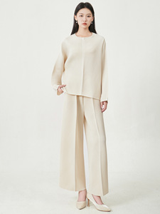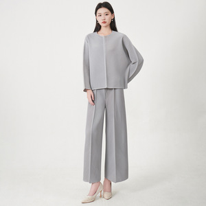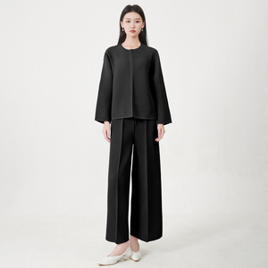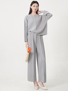 三宅时尚套装裤女装高级感宽松圆领长袖上衣阔腿直筒裤通勤两件套