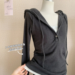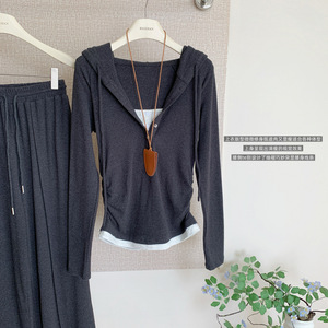 sporty chic*磨毛连帽假两件T恤卫衣抽绳休闲裤套装女秋