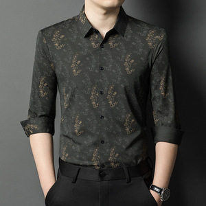 2025新款高弹无痕男士衬衫秋季中年花衬衫高级感翻领长袖衬衣男