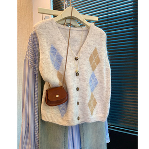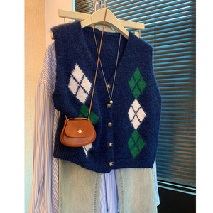 复古菱形V领针织背心 女2025秋季新款坎肩马甲外搭上衣宽松背心