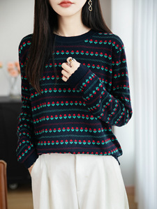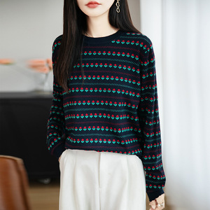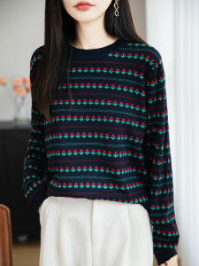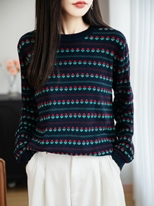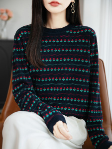 2025年早秋新款精纺羊毛圆领针织衫长袖女设计感小花提花套头上衣