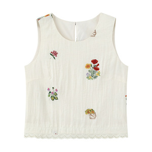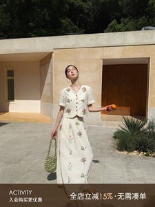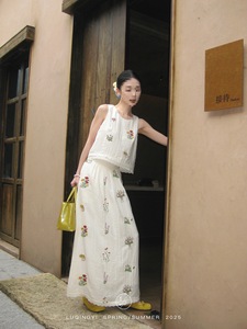 鹭青一原创【事事幽】亚麻重工绣花短袖T恤女夏慵懒风半身裙套装