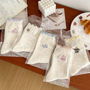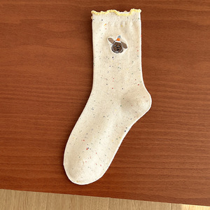 木耳边袜子女中筒袜卡通动物刺绣女袜秋冬季点子纱纯棉袜布标袜女