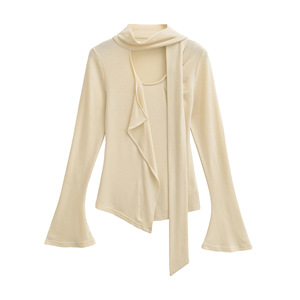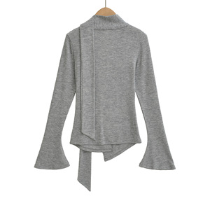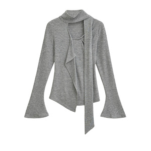 秋季新款设计感荷叶边飘带长袖T恤女 修身显瘦时尚系带上衣女