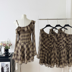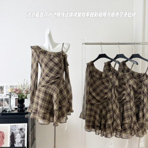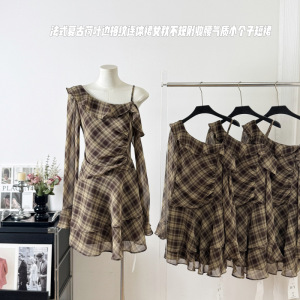 法式复古荷叶边格子连衣裙女设计感不规则收腰气质露肩短裙子秋季