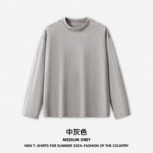 DE男装|跨境270G蜡洗长袖t恤男纯棉重磅美式圆领水洗做旧长袖t恤