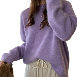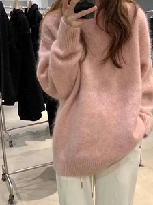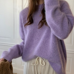 温柔浣熊绒圆领毛衣女宽松外穿秋冬慵懒风套头蓝色软糯打底针织衫