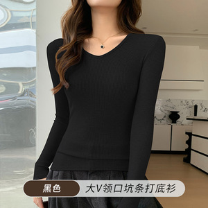 K1301韩系内搭长袖V领条纹针织衫女秋冬季新款修身显瘦打底衫上衣