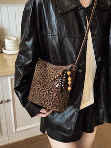 真皮女包高级感豹纹包包女2025新款手提袋女休闲水桶包单肩斜挎包