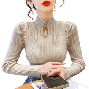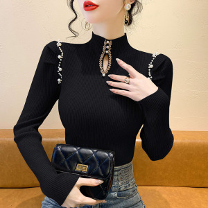 2025秋冬季新款修身针织打底衫上衣女设计感钉珠泡泡袖内搭毛衣女
