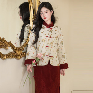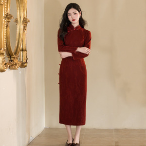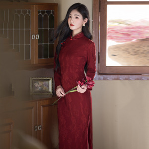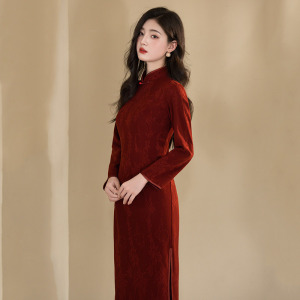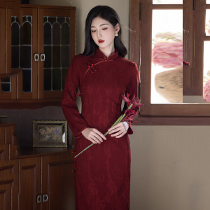 红色国风新中式长款秋季长袖旗袍改良年轻款女马甲外套两件套秋冬