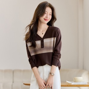 V领条纹针织衫女2025春秋新款慵懒风宽松复古毛衣遮屁股休闲上衣