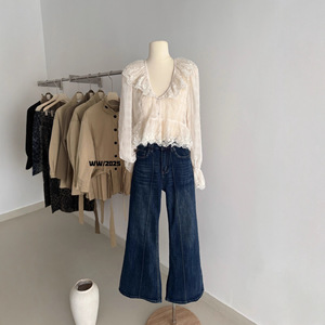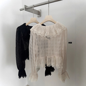 2025秋季新款蕾丝花边喇叭袖长袖上衣女早秋气质短款微透小衫