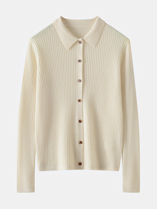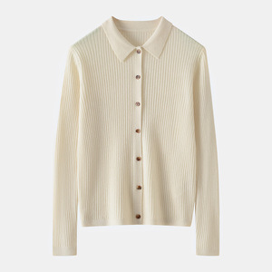 精纺100细羊毛Polo领针织开衫女外套修身显瘦长袖薄毛衣外搭简约