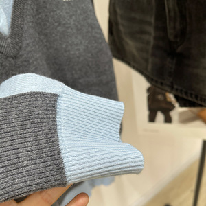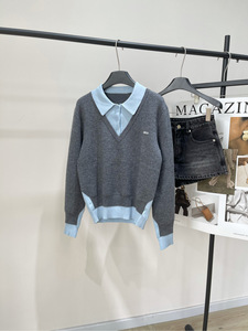 2025早秋灰蓝拼色假两件单排扣polo长袖毛衣宽松显瘦时尚女款上衣