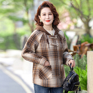 中年妈妈秋装格子毛呢外套短款夹克2025新款中老年女装春秋上衣服