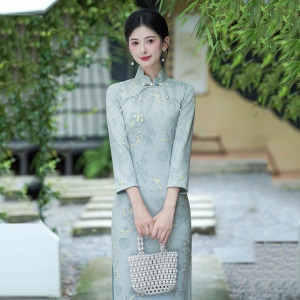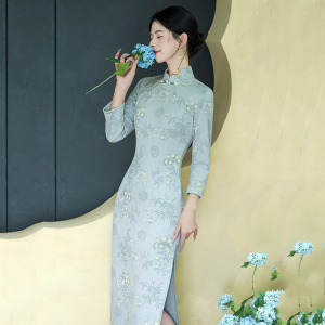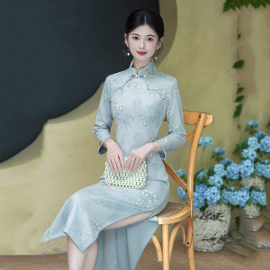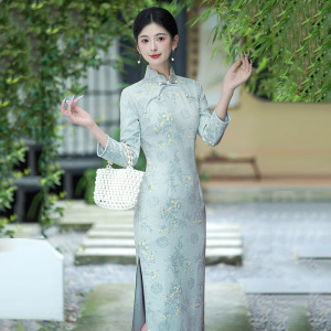 双襟国风新中式长款秋季长袖旗袍改良年轻款女复古修身收腰秋冬装