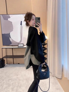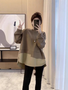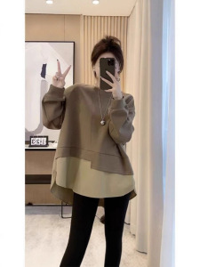 大码女装秋季中长款假两件遮肚子气质显瘦卫衣女宽松长袖上衣胖MM