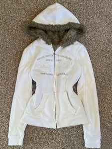 美式复古vintage 古着白色字母毛领连帽卫衣秋冬拉链上衣加绒外套