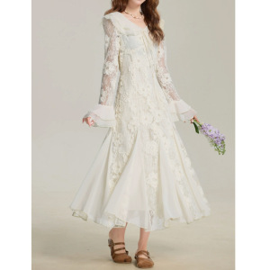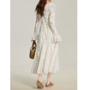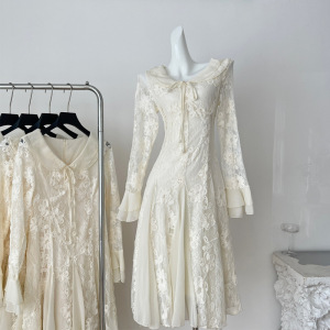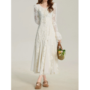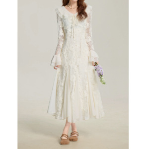 【油画栀子】气质温柔风杏色长袖连衣裙秋季新款超仙鱼尾裙2025新