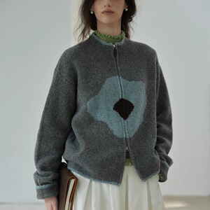 【现货】复古撞色花朵拉链针织开衫女秋冬慵懒风软糯毛衣通勤外套