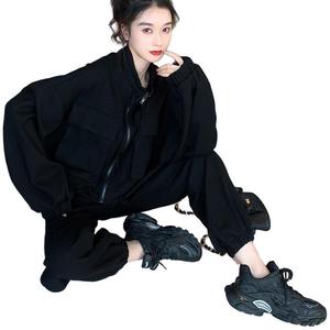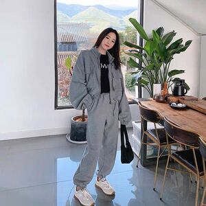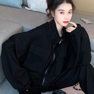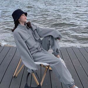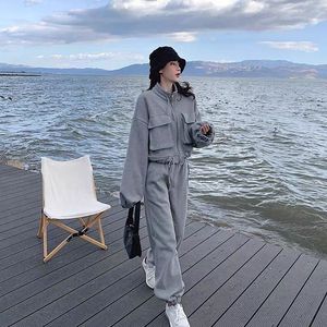 灰色时尚休闲工装套装女2025秋季新款韩版宽松短外套阔腿裤两件套