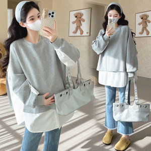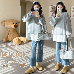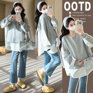 现货孕妇装美式灰色孕妇卫衣秋慵懒宽松休闲假两件上衣宽松遮臀