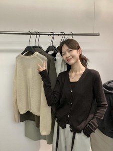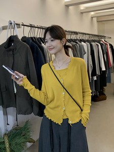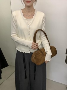 MISS密思家-秋季韩系简约木耳边坑条假两件圆领长袖针织衫女A0828