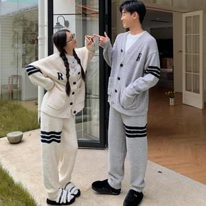 秋冬季半边绒情侣睡衣女加绒加厚R字开衫高级感舒适毛绒家居服男