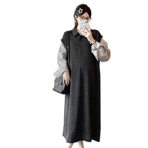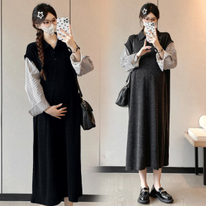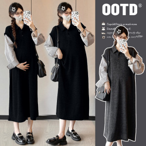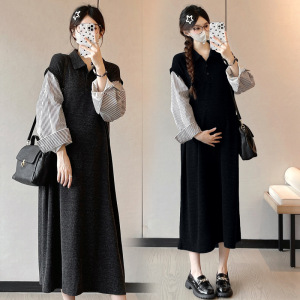 孕妇装春秋季假两件拼接时尚款宽松显瘦过膝潮妈秋冬季休闲连衣裙