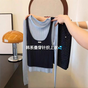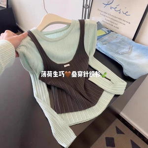 撞色假两件长袖针织衫女2025早秋新款韩系氛围感穿搭修身内搭上衣