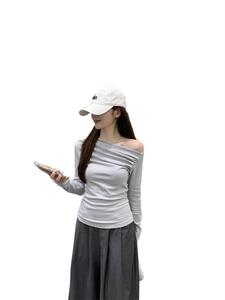 2025秋季新款韩系纯欲气质斜肩修身显瘦褶皱露肩长袖T恤上衣女潮1